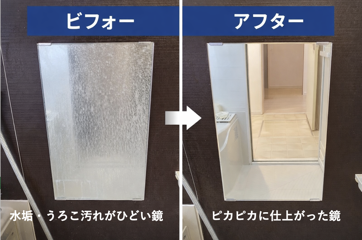 浴室の鏡に付着した頑固なウロコ汚れを除去しました。